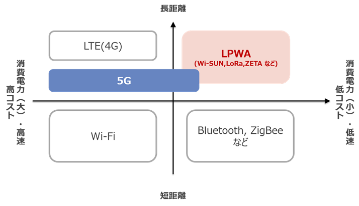 その他、LPWAには、LoRa、Sigfox、ZETA 等、様々な規格が存在します。これらのLPWAの規格の違いは、ここでは割愛しますが、これらのLPWAの応用例としては、農業、スマートハウス、スマートシティ等、多岐にわたります。