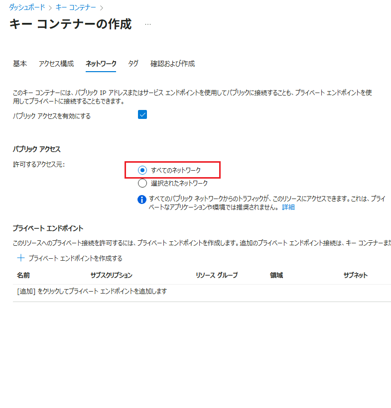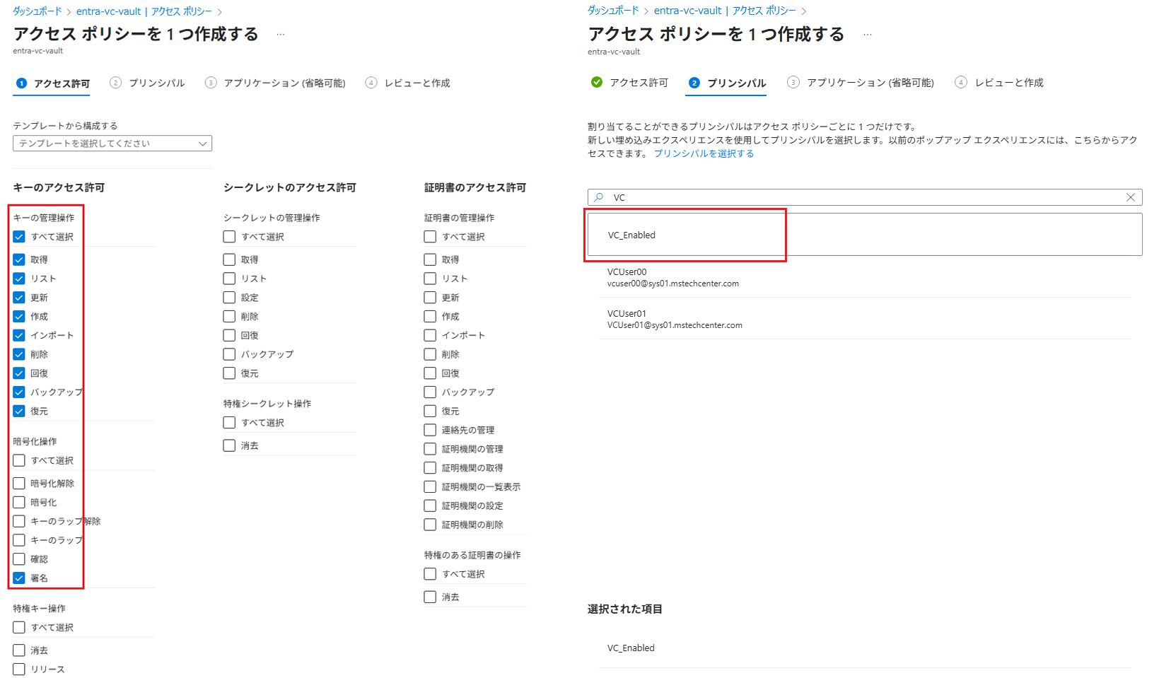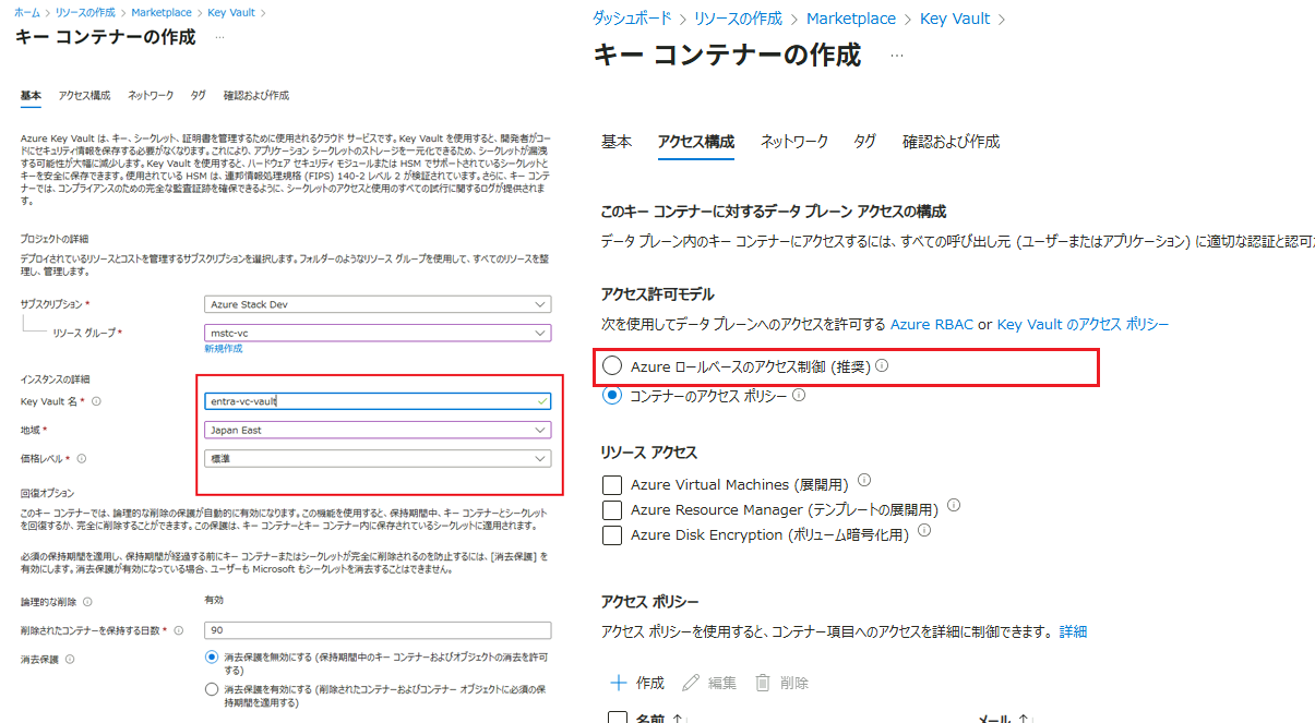 Entra Verified IDへのアクセスの際に使用する、シークレットを保護管理するリソースになります。Entra Verified ID構成以前に作成する必要があります。キーコンテナをまず作成します。この時[アクセス構成]については[コンテナーのアクセスポリシー]ベースでアクセス許可を設定する必要があります。キーのアクセス許可だけで大丈夫ですが、キーの管理操作のほか、[署名]の権限を持っている必要があります。