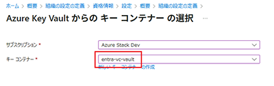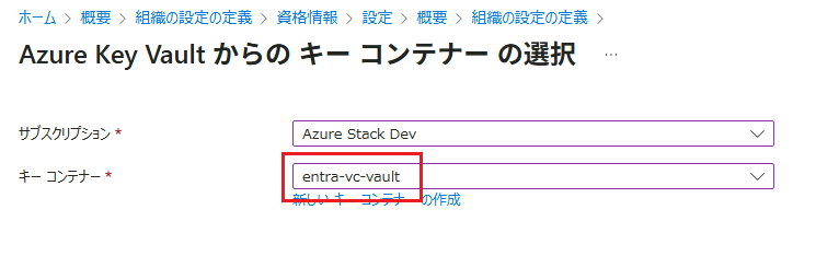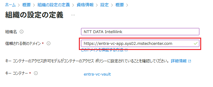 [キー コンテナー]は先ほど作成したKey Vaultを指定します。[信頼される側のドメイン]については[外部WebサーバーのFQDN]になるので、注意してください。この時点では(名前解決は必須でないので)任意のドメインで大丈夫ですが、一度設定してしまうと変更ができず、どうしてもという場合はVerified IDをリセットしなければならなくなります。