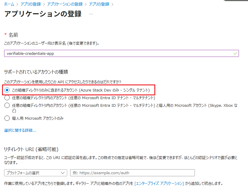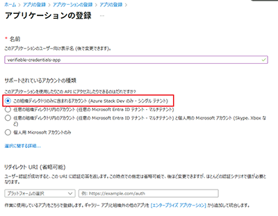 Entra Verified IDへのWebアプリの登録を行います。[Microsoft Entra ID]-[アプリの登録]から以下の設定でアプリを追加します。名前は任意でよく、リダイレクトURIは登録不要です。