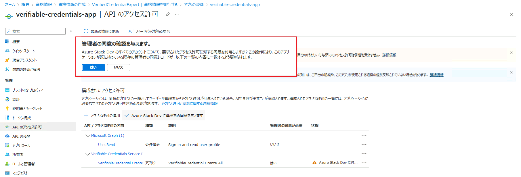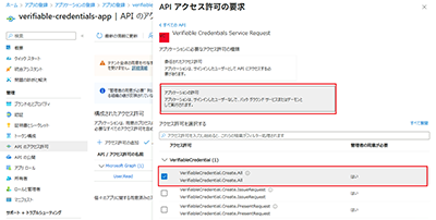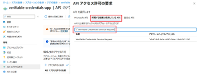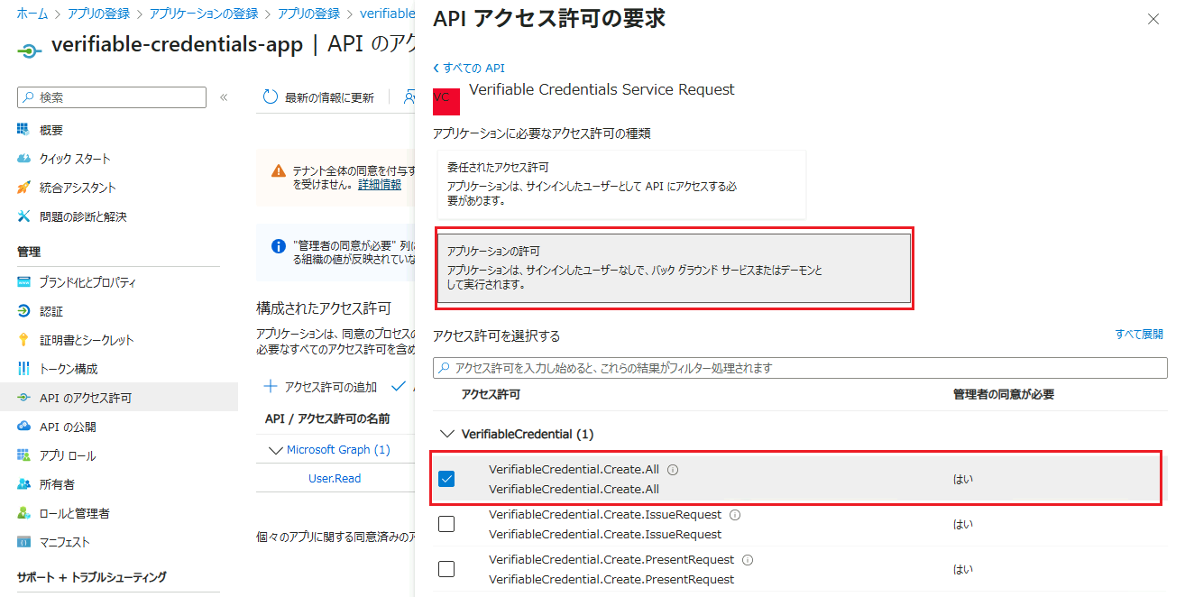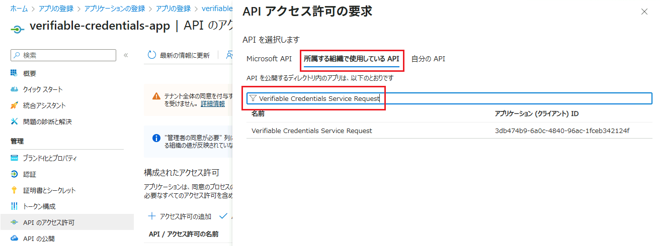続いてAPIアクセス許可の設定を行います。[APIアクセス許可の要求]-[所属する組織で使用しているAPI]から[Verifiable Credentials Service Request]の権限を検索で探します。[アプリケーションの許可]の[VerifiableCredential.Create.All]を選択します。アクセス許可が追加出来たら[<テナント名>に管理者の同意の確認を与えます]の設定を忘れないようにします。