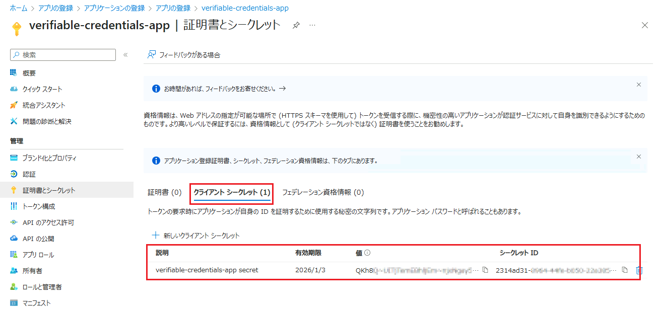 この後、アプリが利用するシークレットを作成します。シークレット文字列は作成時に一度しか表示されないので、確実にコピーを保存しておきます。