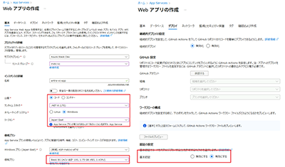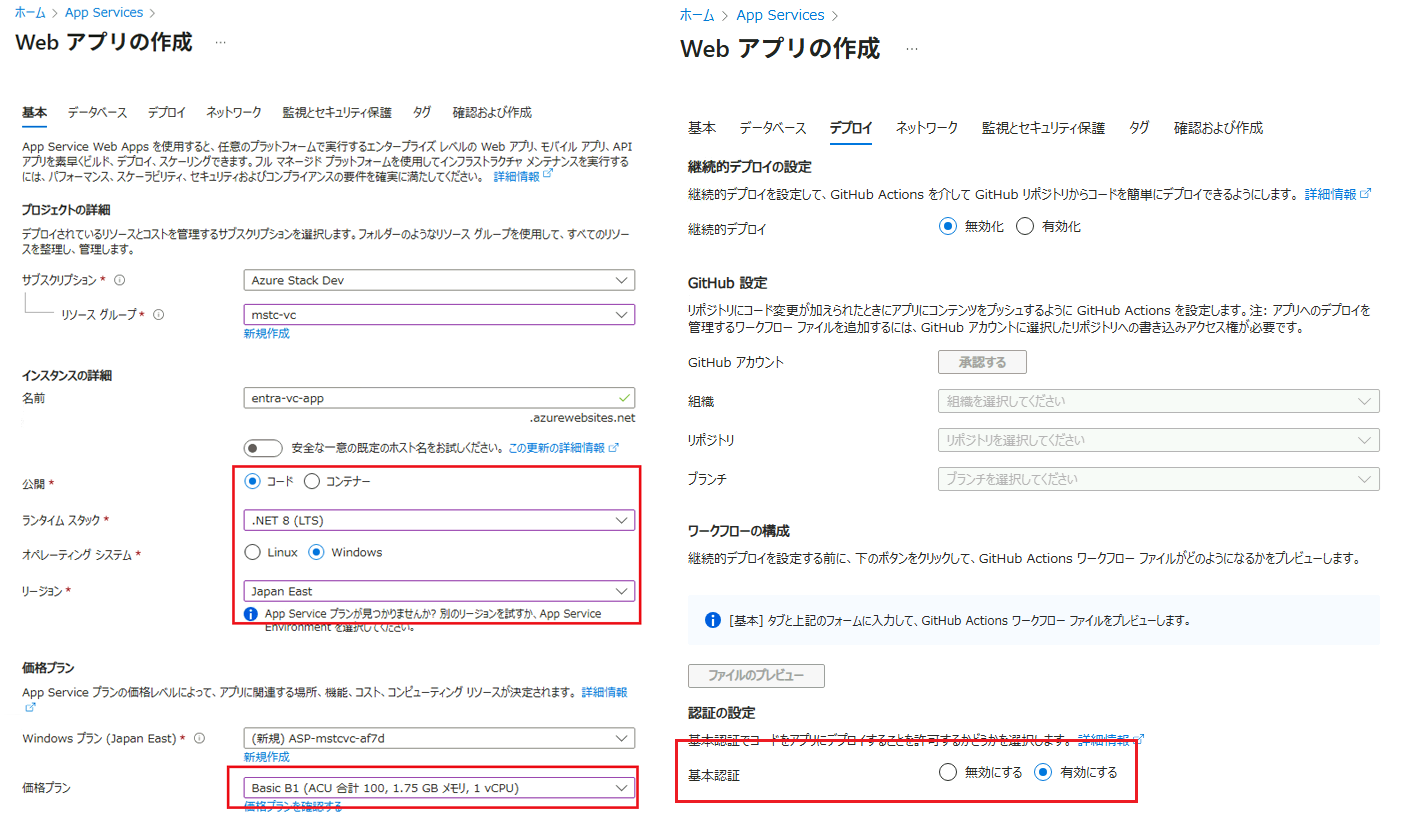 公開するWebサーバーを構成します。Azure App Servicesがやりやすいです。以下のように構成します。Azure ServiceプランはBasic B1を選択しましたが、もっと小さいもの(=安いもの)でも大丈夫です。データベースやネットワークは不要です。ただし[認証の設定]の[基本認証]は有効にしておきます。SFTPでアップロードする際に必要です。