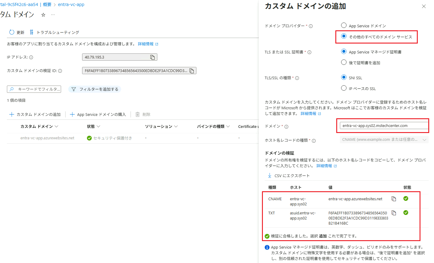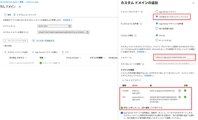 続いてApp Serviceのカスタムドメインの設定を行います。先の[Entra Verified IDの詳細セットアップ①]で指定した[信頼されるドメイン]のFQFNが名前解決できること、https通信の要件(SSL証明書等)を満たす必要があります。カスタムドメイン設定を行うだけで、すべてが設定できます。