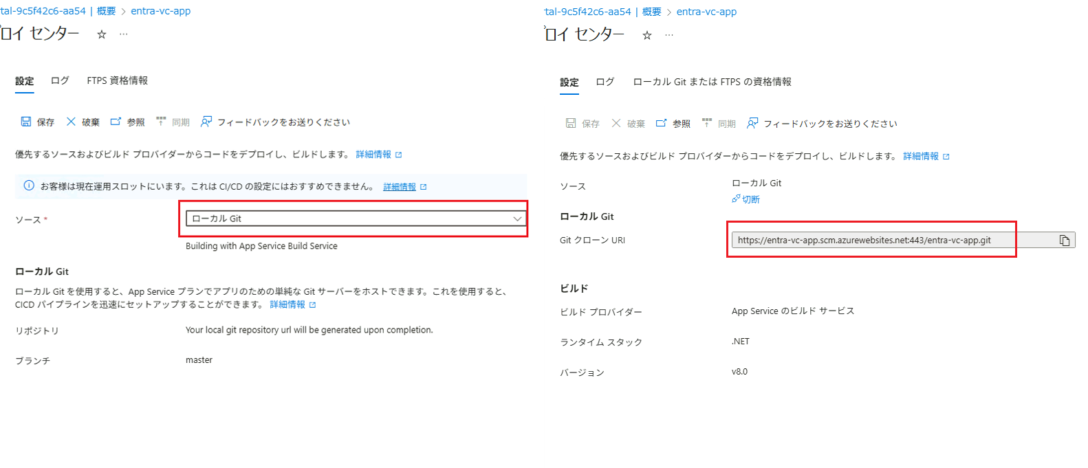 次に[ローカルGit]によるデプロイ環境構築を行います。[App Service]-[<アプリ名>]-[デプロイ]-[デプロイセンター]の[設定]で、[ローカルGit]を選択します。設定後に[GitクローンURI]をメモします。