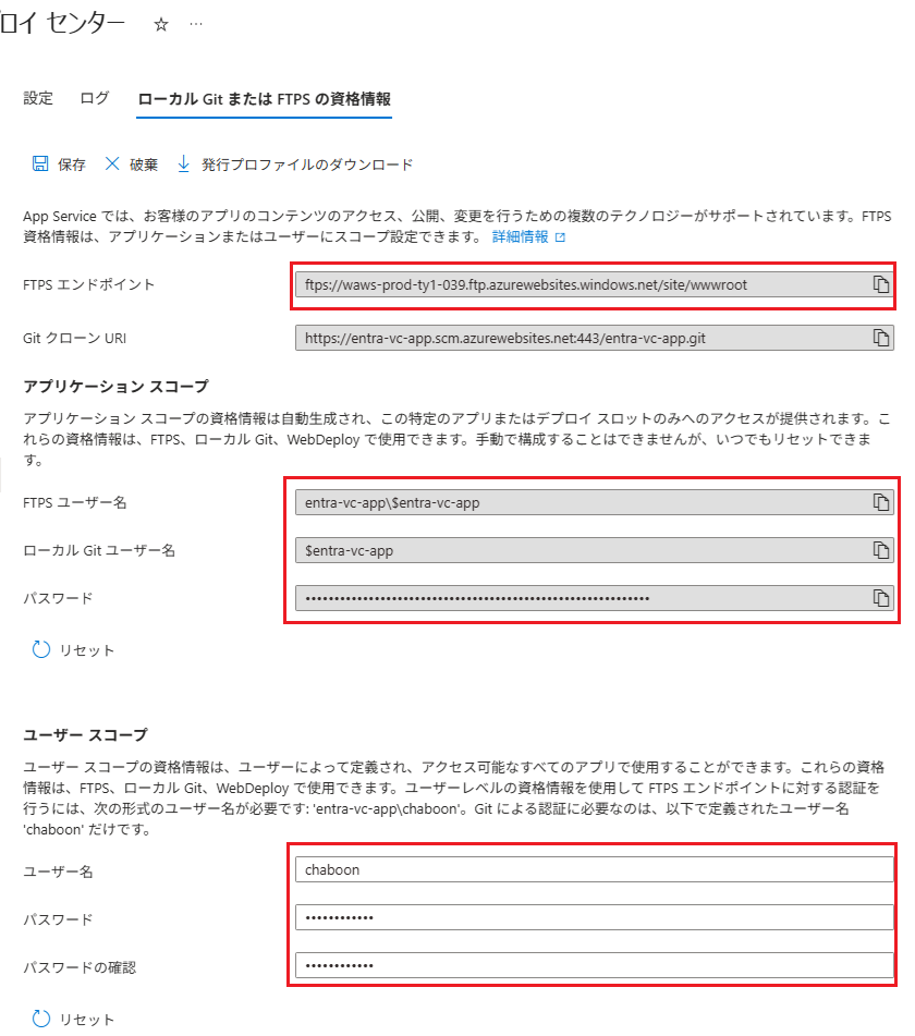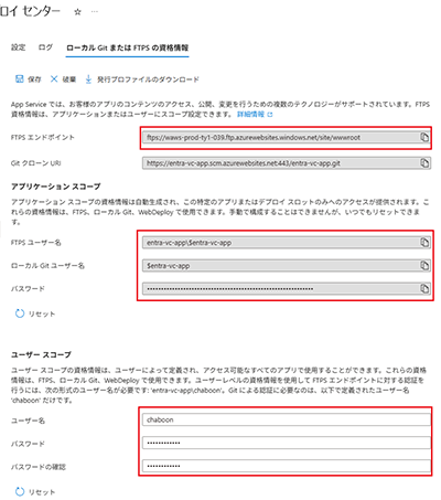 あわせて[ローカルGitまたはFTPSの資格情報]の項目で、ユーザースコープのユーザー名とパスワードを指定します。このアカウントはGitアップロード時に利用します。