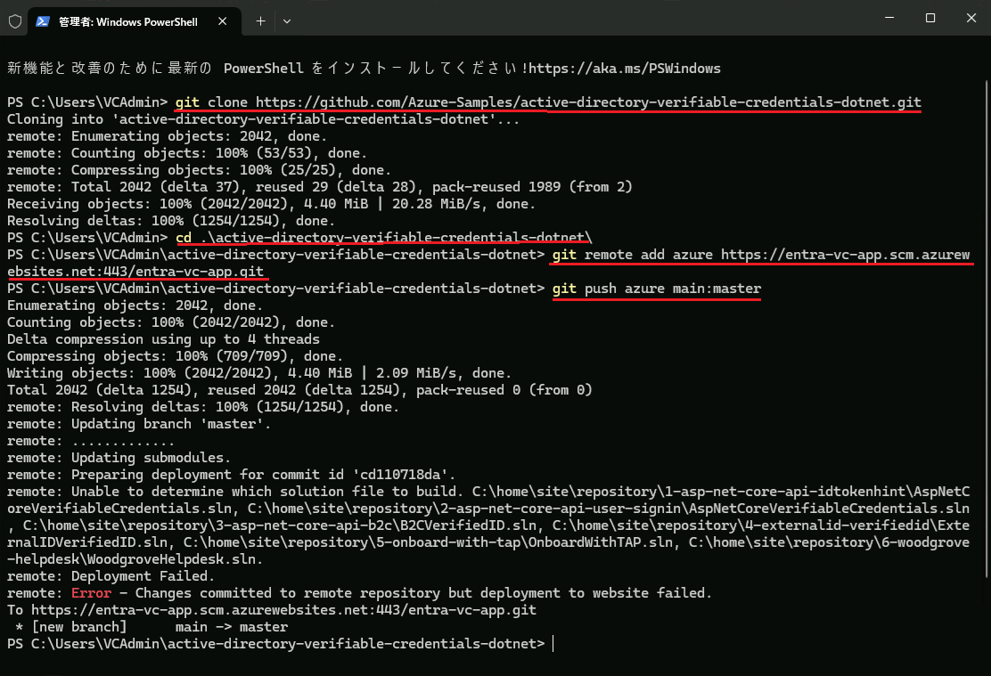ここまで来たら、MicrosoftのサンプルアプリをGitクローンし、Webアプリにアップロードします。以下のコマンドです。アップロード時にGitアカウントを求められたら、ユーザースコープのID/パスワードを入力します。Git pushコマンドでエラーが出た場合、何回か繰り返すと収束します。