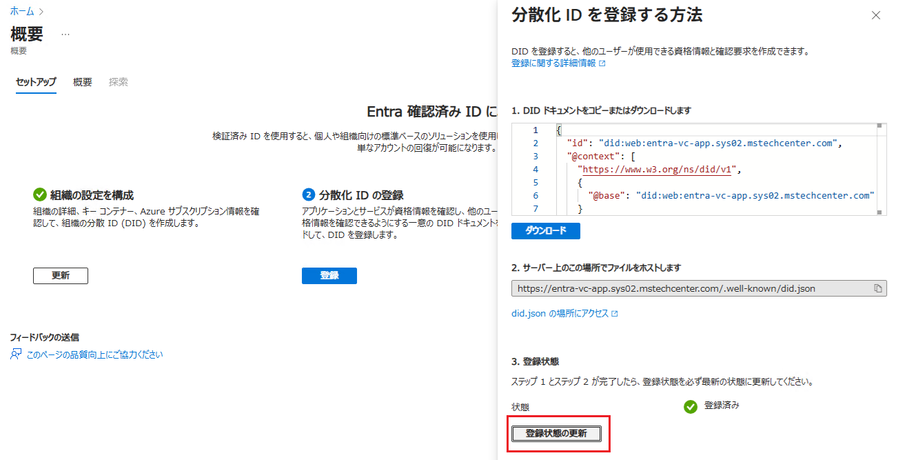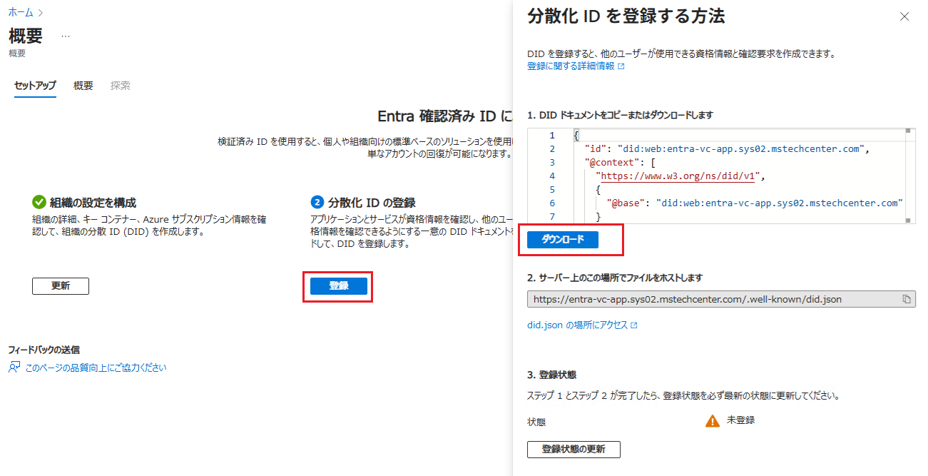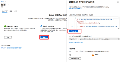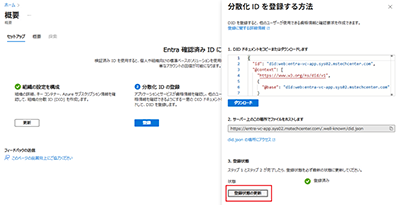 [検証済みID]-[概要]-[セットアップ]-[分散化IDの登録]から登録を行います。今回参照が必要な、Entra Verifiable IDによって作成済みのDIDドキュメント(did.json)をいったんダウンロードしたうえ、Webサーバーにアップロードします。アップロード先は[https://<WebサーバーFQDN>/.well-known/did-configuration.json]になります。