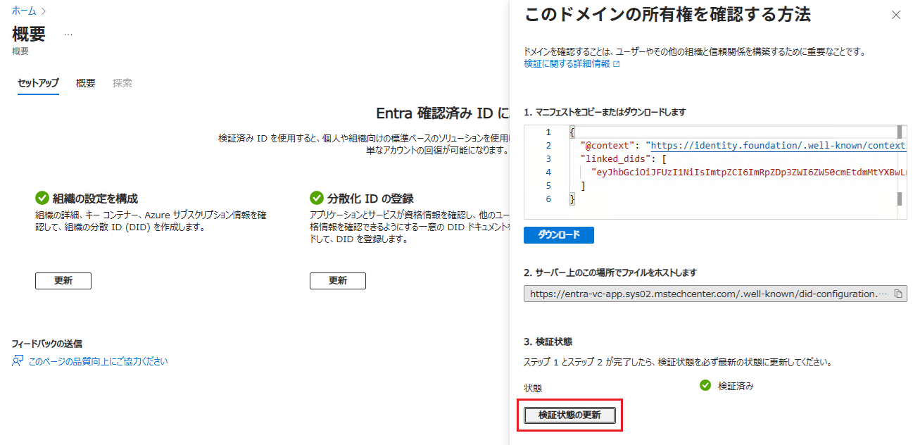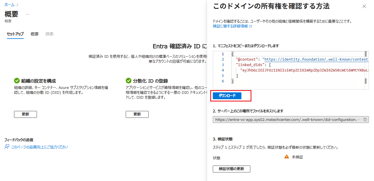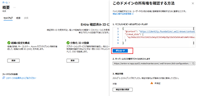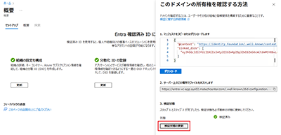 [検証済みID]-[概要]-[セットアップ]-[ドメインの所有権を確認します]から確認を行います。今回参照が必要な、Entra Verifiable IDによって作成済みのDIDドメインリンクファイル(did-configuration.json)をいったんダウンロードしたうえ、Webサーバーにアップロードします。アップロード先は[https://<WebサーバーFQDN>/.well-known/did-configuration.json]になります。