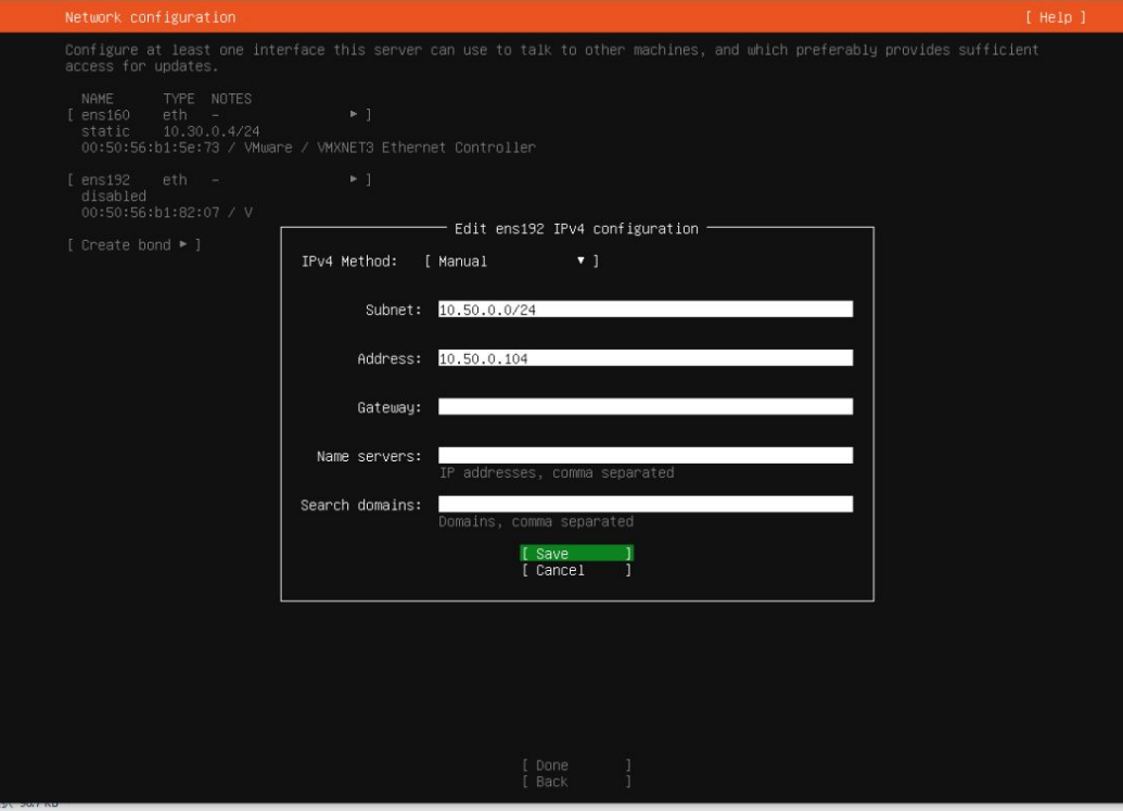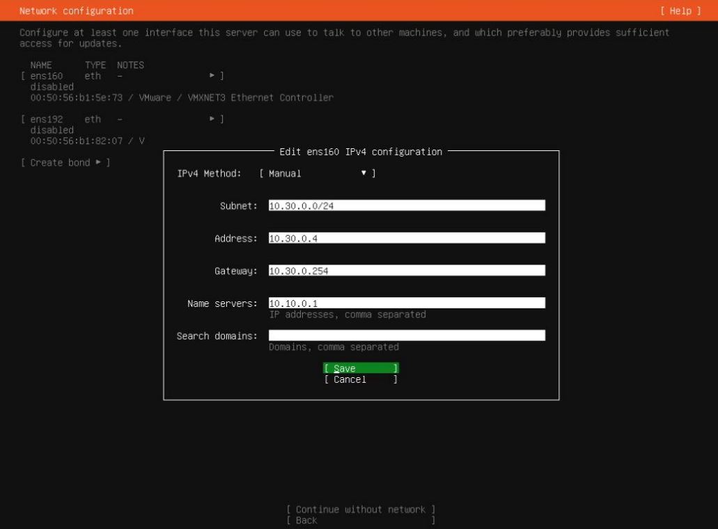 ⑤ 10.30.0.0/24のvNICのアドレスを設定します。ens160はbondせずそのままIPv4アドレスをManualで設定し進めます。Search domainsにホスト名のみの場合に補完して参照するdomainを入力します。