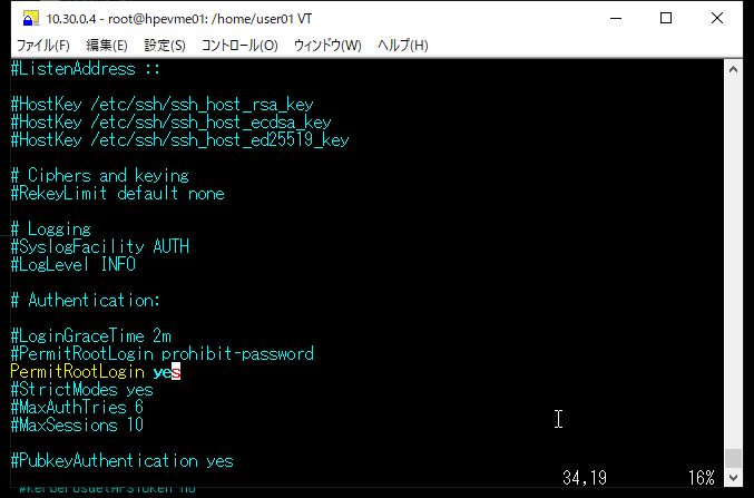② PermitRootLoginパラメータをyesに変更します。