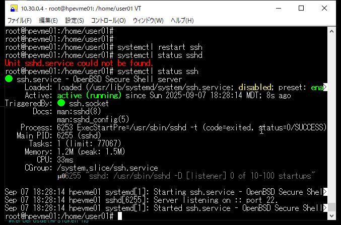 ③ sshdを再起動し、ステータスに問題がないことを確認します。
