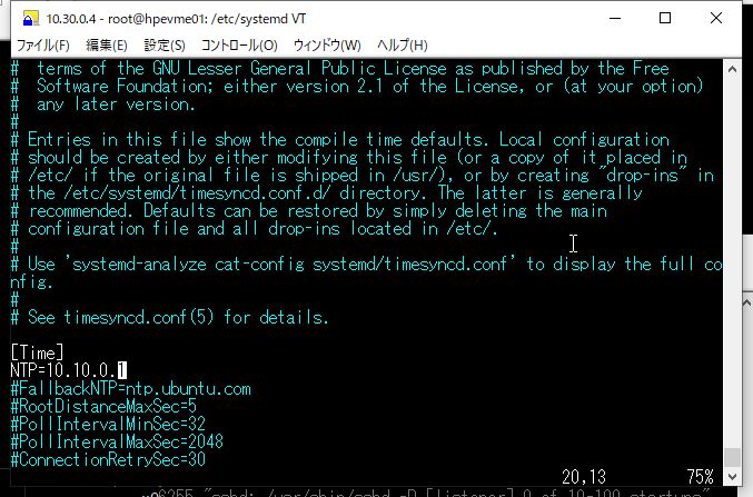 ④ /etc/system/timesyncd.confを編集し、NTPサーバーのIPを指定します。