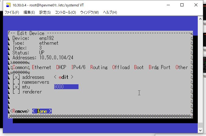 iSCSI用インターフェースとして指定したデバイス(例:ens192、ネットワーク 10.50.0.0/24)を編集します。