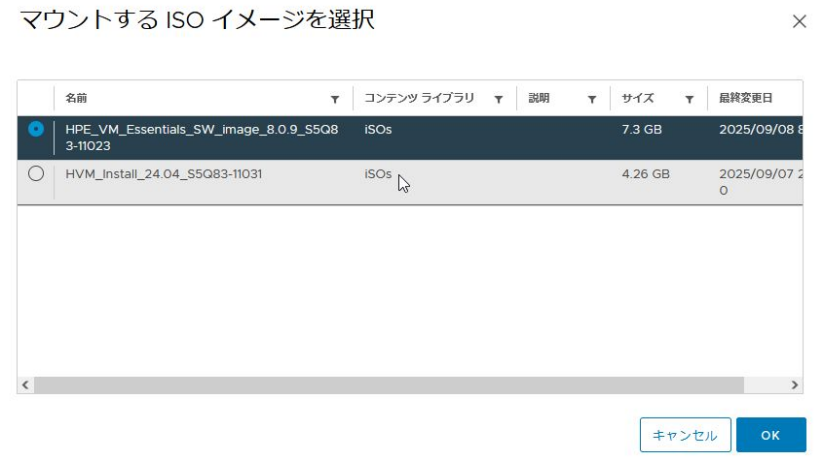 ① HPE_VM_Essentials_SW_imageのISOをホストに認識させます。