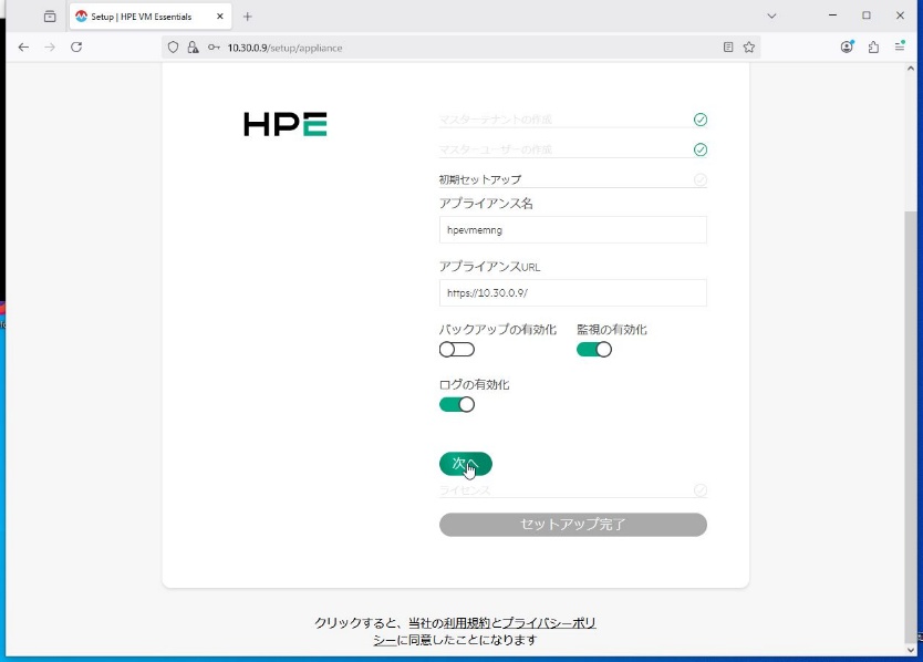 ③ アプライアンス名はHVM Managerのhostnameと同じ情報を入力。バックアップNFSバックアップ領域が出来てから有効にするので、この時点では無効のまま進めます。