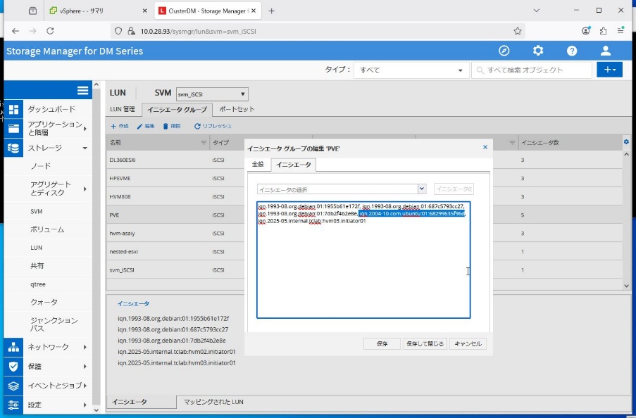 ② 今回はLenovo版ONTAPのiSCSI LUNを利用していますがイニシエータグループに先ほど調べたiqnを登録します。