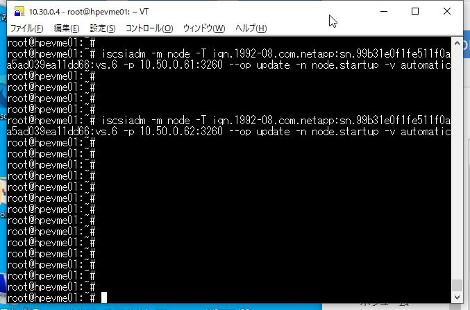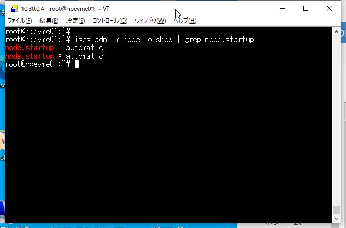 # iscsisdm -m node -T [iqn番号] -p [ターゲットのIPアドレス:接続ポート] –op update -n node.startup -v automatic