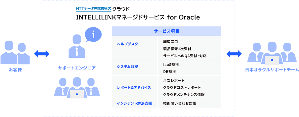 - Oracle Cloud に構築したDBシステムの「システム運用(システムのイベント監視、メンテナンスの計画や実施などの運用オペレーション、従量課金のクラウドサービス利用時のコスト管理)、システム保守(システムの問題、インシデントの管理、対応)」を、お客様に代わってリモートで支援する、年間契約型のサービスです。 経験豊富なサポートエンジニアが、ヘルプデスクやシステムの監視等をはじめ、お客様の最適なクラウド運用を支援します。 システム異常を検知し、対策についてプロアクティブな報告・アドバイスをすることで、インシデントを未然に防ぐ等、高度なサポートを提供します。