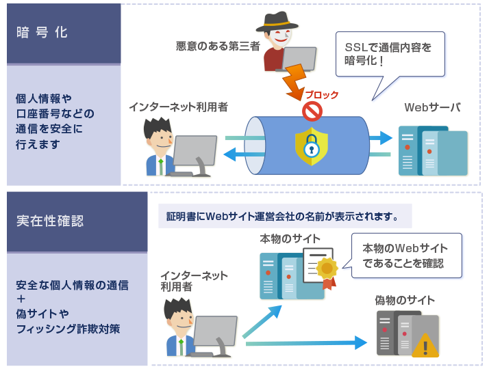 ユーザーとWebサイト間の通信を「暗号化」し、インターネット経路上での悪意ある第三者からの盗聴を防ぎます。また、信頼ある認証局によって「実在性が確認」されているWebサイトであることを証明できます。